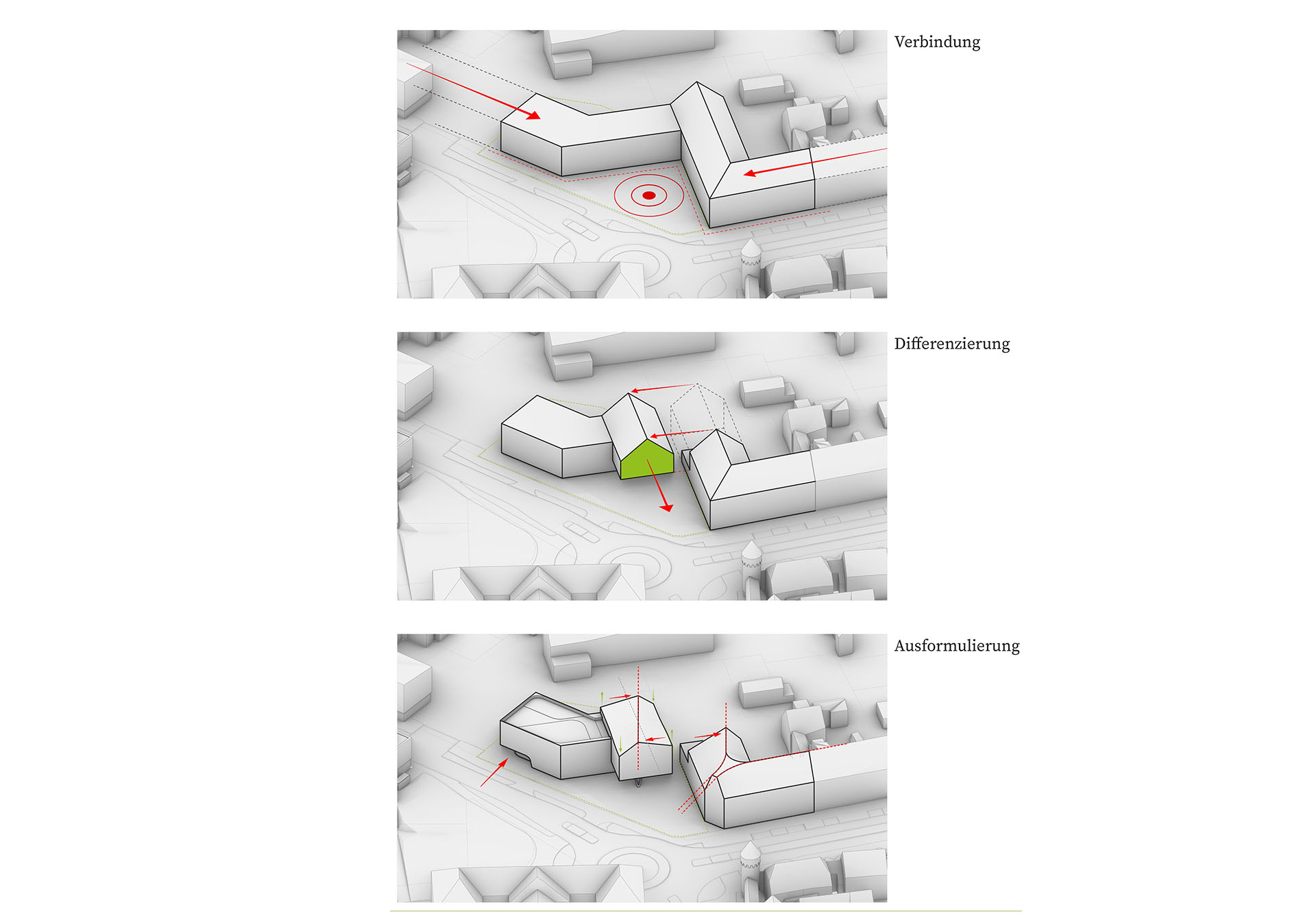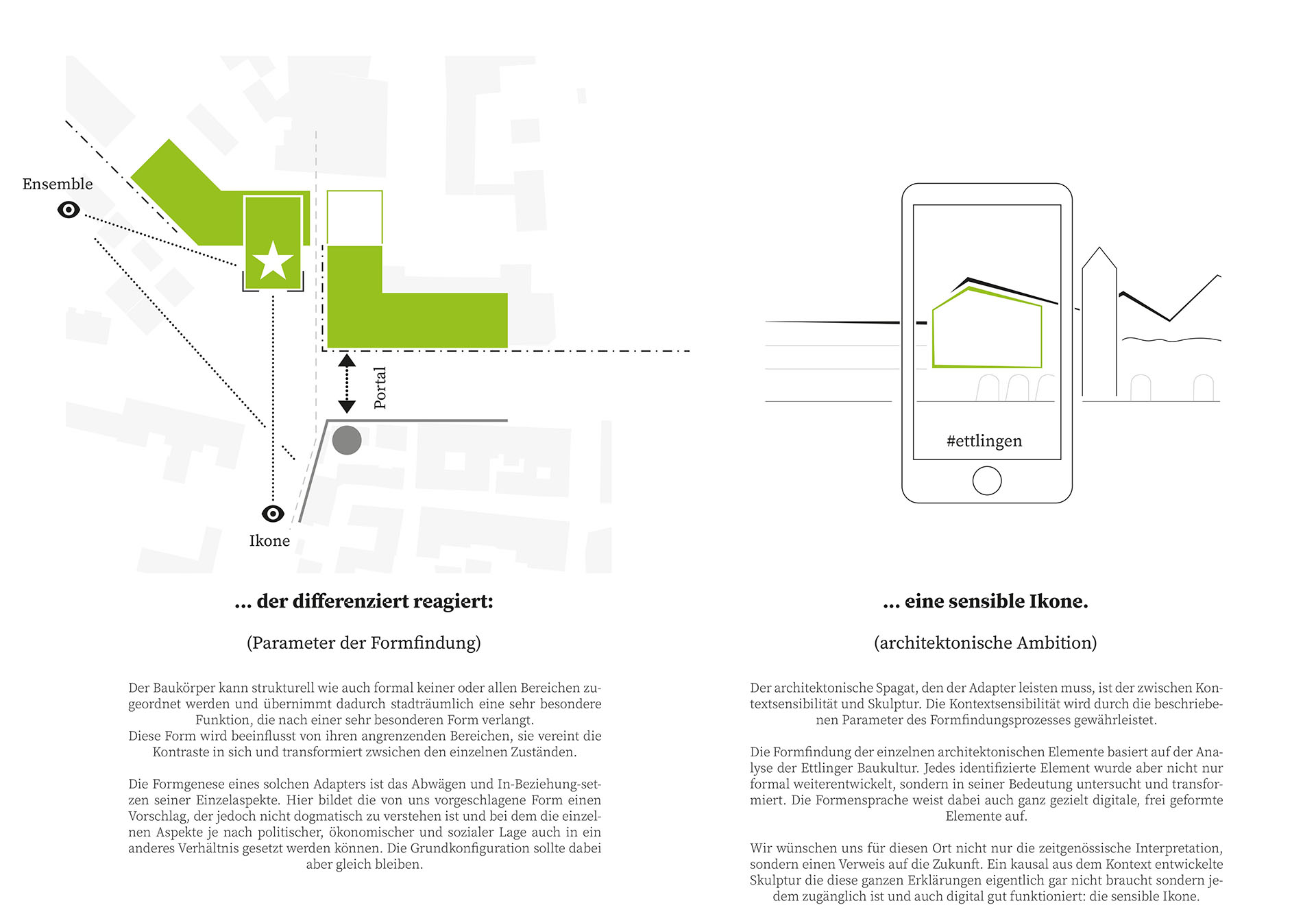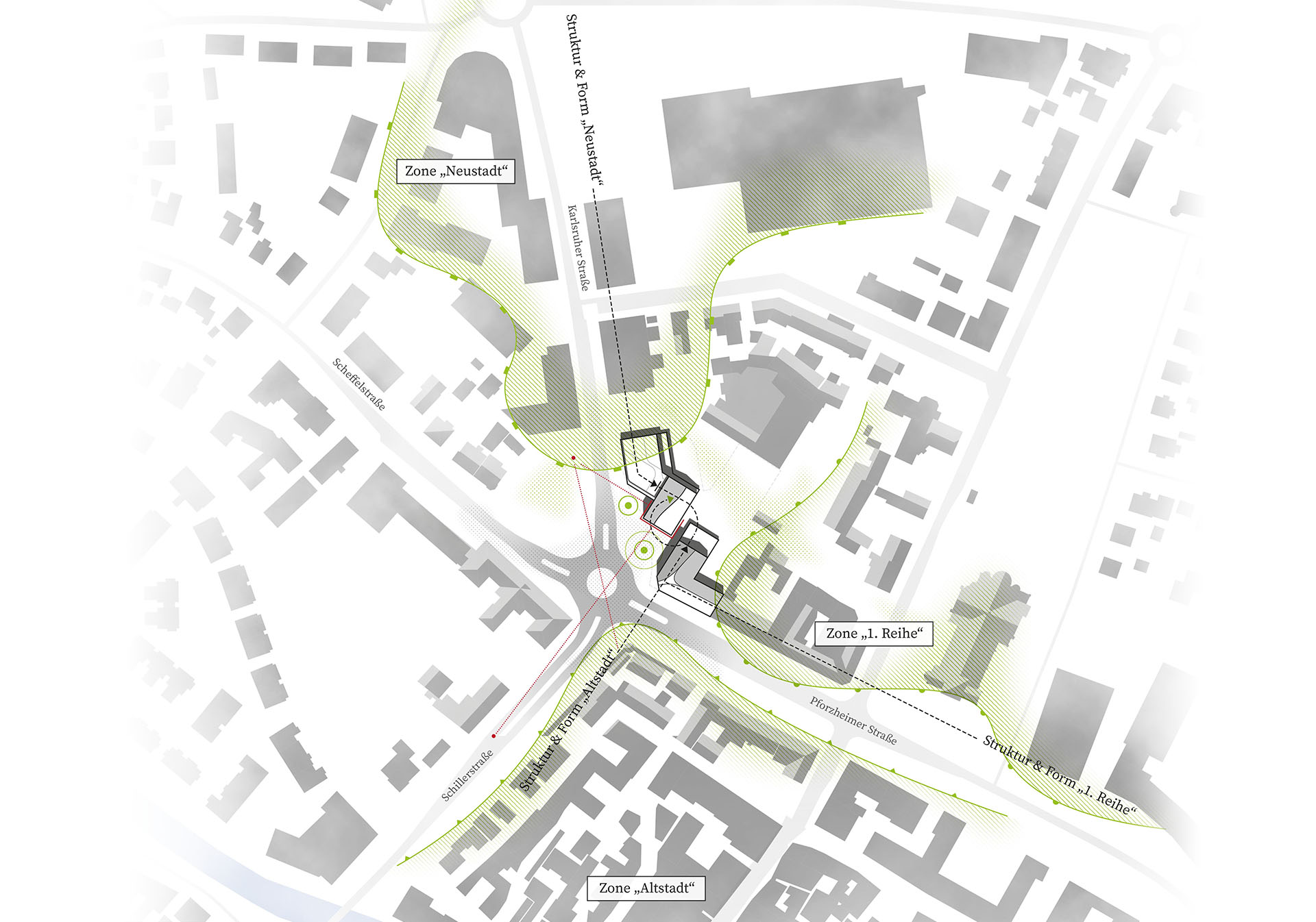 Ausgangspunkt unseres Entwurfs war die baukulturelle Identität Ettlingens. Aus den charakteristischen architektonischen Merkmalen der Stadt entwickelten wir eine eigenständige, zukunftsorientierte „Architektursprache“, die den gewachsenen Charakter Ettlingens aufgreift und zugleich neue Perspektiven eröffnet.