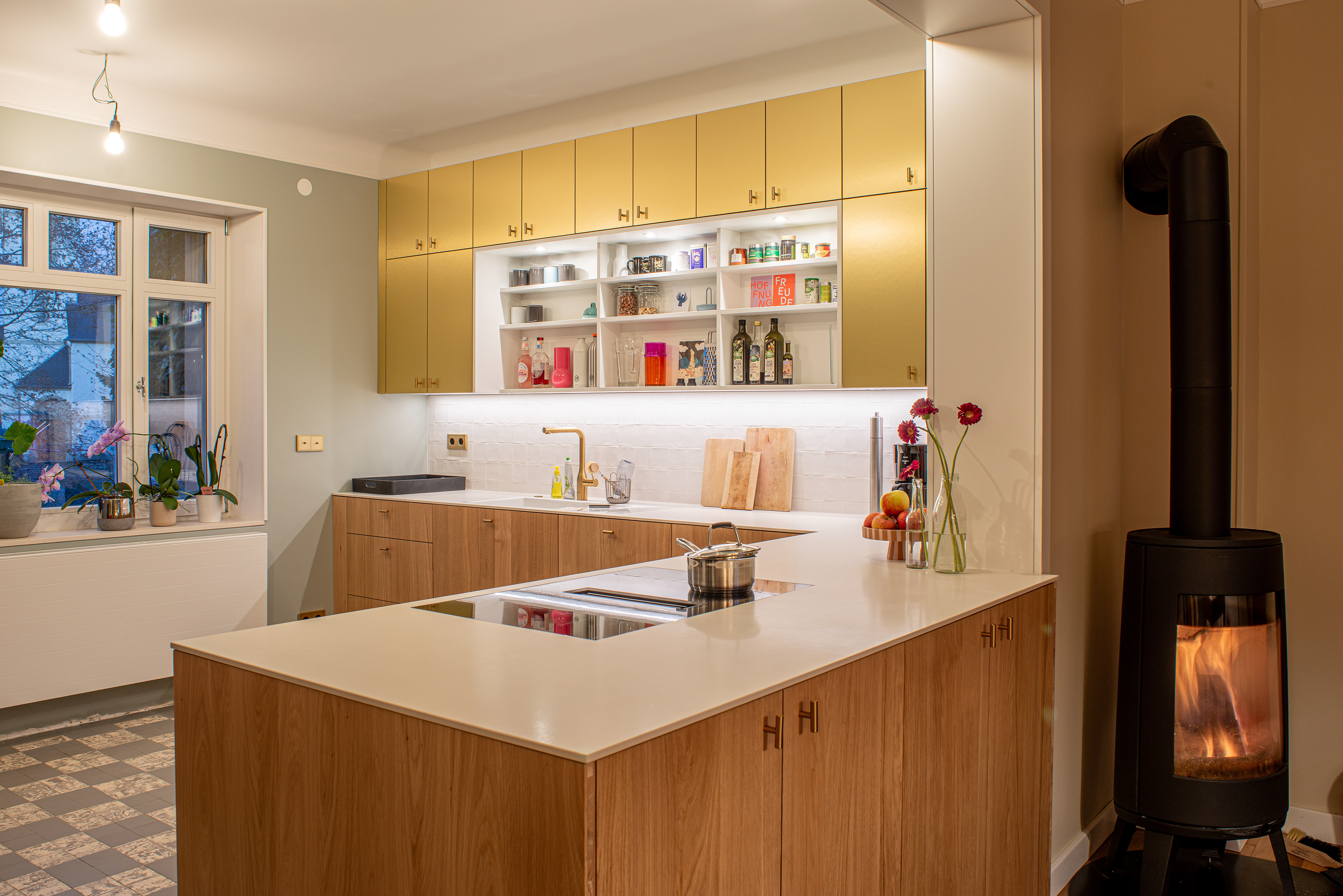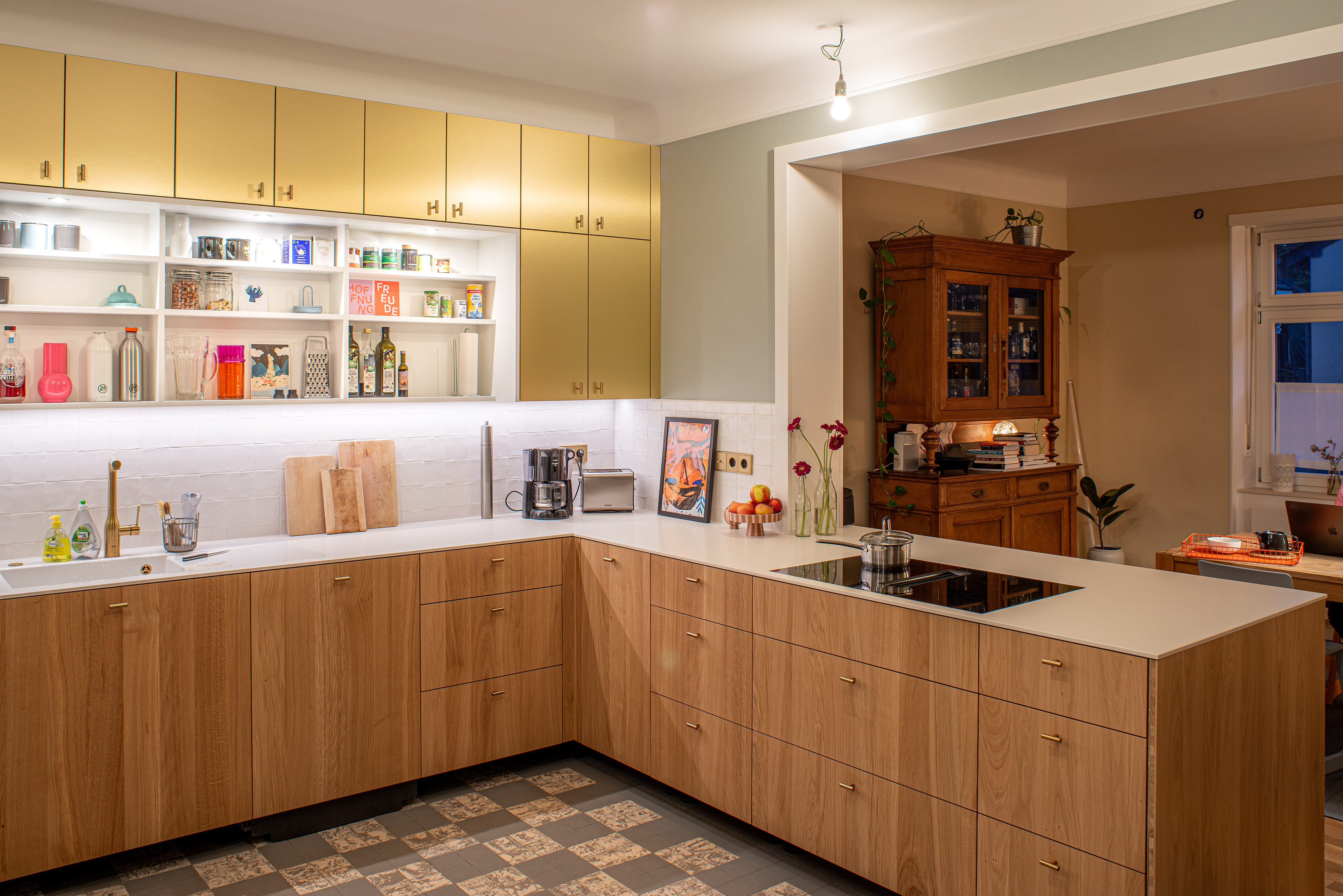Statt klassische Verzierungen typischer Bauernmöbel aus der Entstehungszeit des Hauses, stehen hochwertige Materialien im Vordergrund, die durch klare Linien zur Geltung kommen. Wärme und Gemütlichkeit entstehen durch das verwendete Eichenholz (3-Schicht-Platten) mit seiner einzigartigen Maserung, die gold leuchtenden Oberflächen der mit Messing-Dekor beschichteten Oberschränke und die handgefertigten Wandfliesen. Das weiße, offene Regal bricht mit der Strenge der Frontenaufteilung, indem es einen lebendigen Einblick in die Nutzung gibt. Es verbindet sich optisch mit der weiß lackierten Zarge ins Esszimmer. Die Anordnung des Herdes hin zum Esszimmer fördert den Dialog zwischen den beiden Raumnutzungen. Ein im Kochfeld integrierter Dunstabzug sorgt dafür, dass das Sichtfeld frei bleibt.